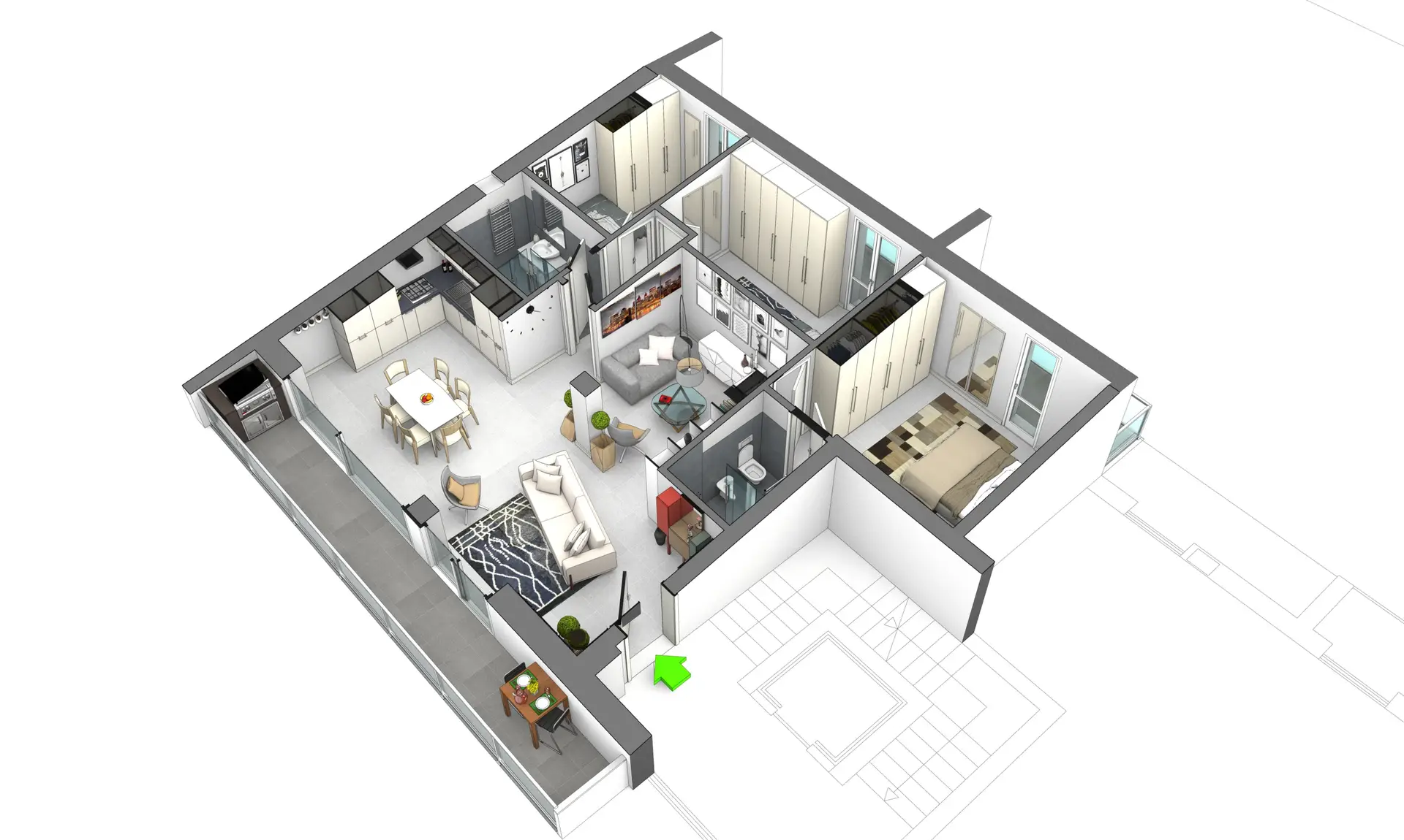 Render di esterni e interni, planimetrie arredate, fotoinserimenti ambientali: non sono tre servizi separati. Sono il sistema che permette all'acquirente di capire esattamente cosa compra, ancora prima che il cantiere parta.